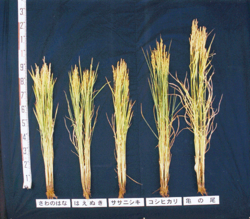 主要品種の草姿の比較。 左より「さわのはな」、「はえぬき」、「ササニシキ」、「コシヒカリ」、「亀の尾」